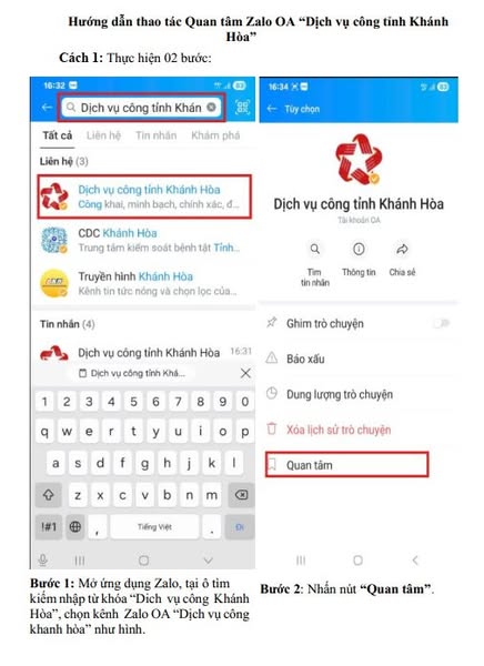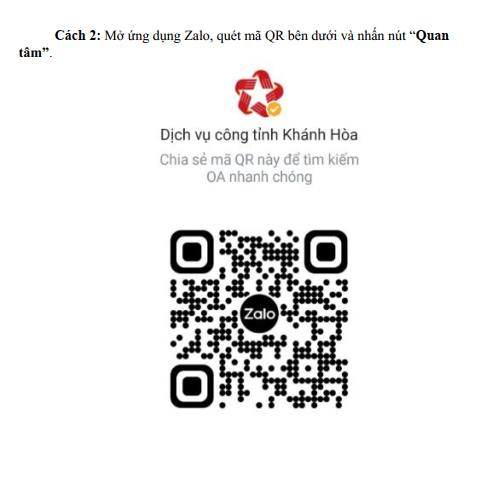 Kênh OA “Dịch vụ công tỉnh Khánh Hòa" trên mạng xã hội Zalo Đây là kênh thông tin chính thống cung cấp thông tin giải quyết dịch vụ công; hỗ trợ hiệu quả cho tổ chức, người dân trong việc cập nhật thông tin giải quyết hồ sơ TTHC. Kênh Zalo OA “Dịch vụ công tỉnh Khánh Hòa” có địa chỉ truy cập tại đường dẫn https://zalo.me/969466815892677713, chính thức hoạt động kể từ ngày 29/9/2025, do Trung tâm Phục vụ hành chính công tỉnh, Văn phòng UBND tỉnh trực tiếp quản lý và vận hành. Tương tác để nắm bắt kịp thời các nội dung trong giải quyết hồ sơ TTHC. Việc truy cập và theo dõi thông tin trên kênh có thể thực hiện theo một trong hai cách theo hướng dẫn hình ảnh kèm theo.