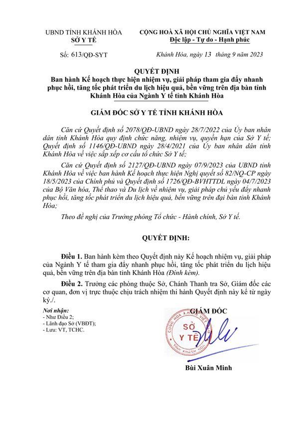QUYẾT ĐỊNH Ban hành Kế hoạch thực hiện nhiệm vụ, giải pháp tham gia đẩy nhanh phục hồi, tăng tốc phát triển du lịch hiệu quả, bền vững trên địa bàn tỉnh Khánh Hòa của Ngành Y tế tỉnh Khánh Hòa