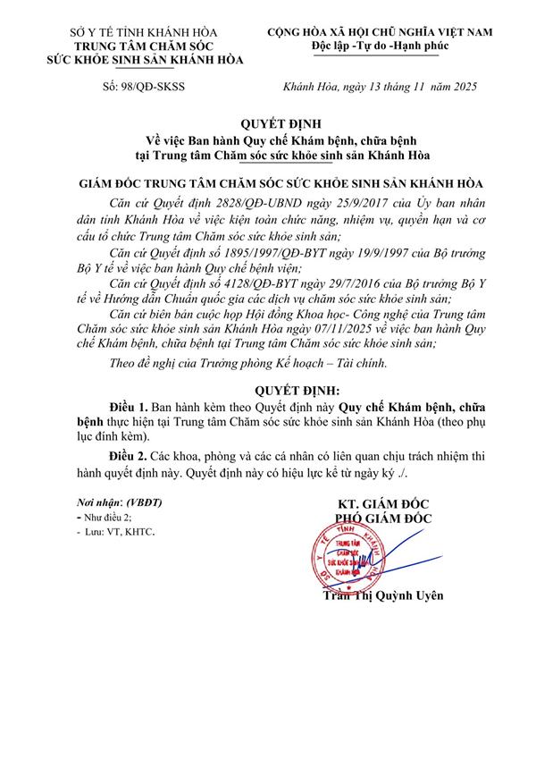 QUYẾT ĐỊNH Về việc Ban hành Quy chế Khám bệnh, chữa bệnh tại Trung tâm Chăm sóc sức khỏe sinh sản Khánh Hòa