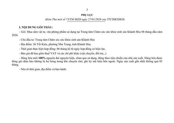 Gói thầu: Thuê đơn vị cung cấp dịch vụ phân tích, xét nghiệm phục vụ công tác chuyên môn năm 2025 của Trung tâm Chăm sóc sức khỏe sinh sản Khánh Hòa
