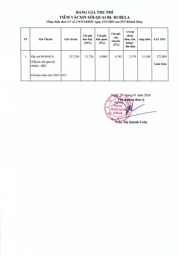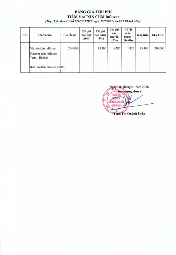 BẢNG GIÁ CÁC DỊCH VỤ THỰC HIỆN TẠI TRUNG TÂM CSSKSS