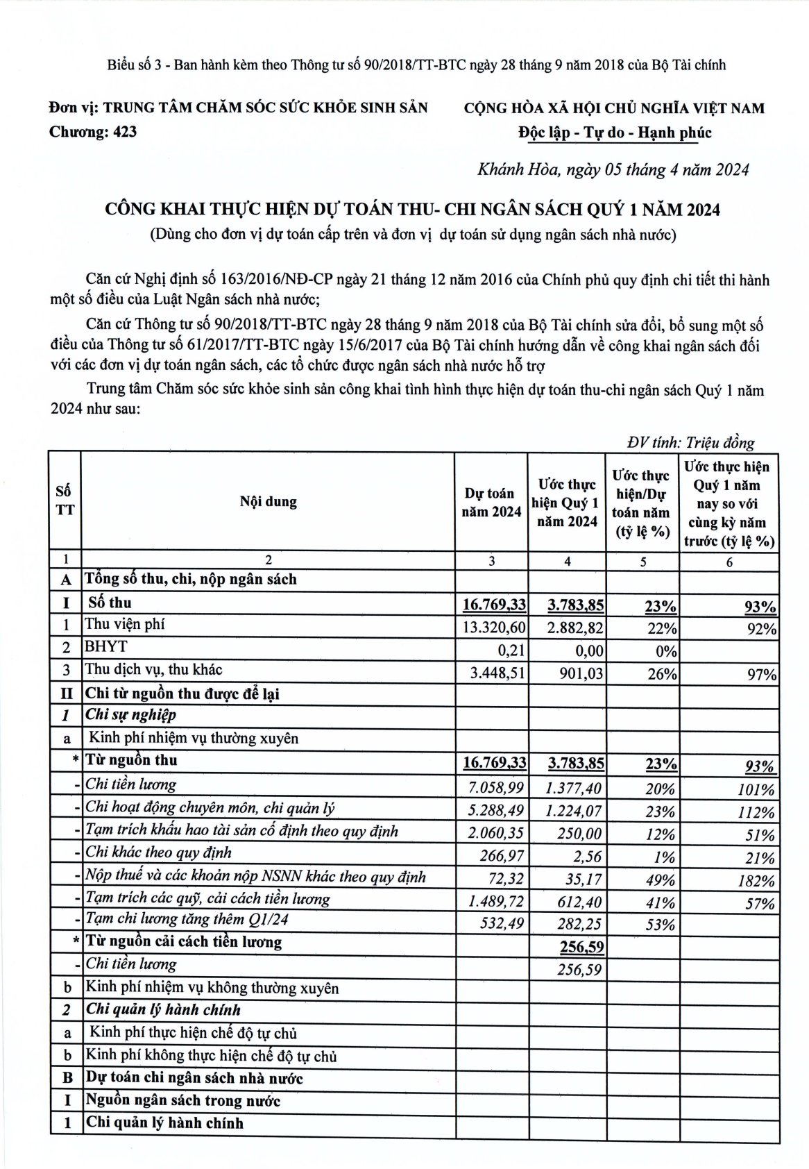 Quyết Định Về việc công khai dự toán ngân sách nhà nước Quý 1 năm 2024