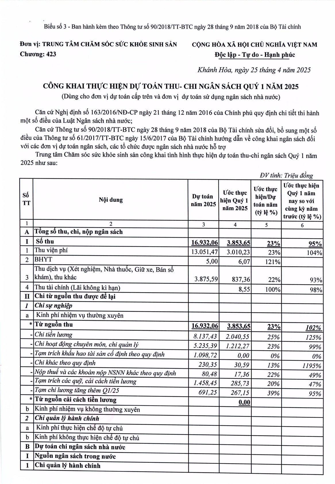 Quyết Định Về việc công khai thực hiện dự toán ngân sách nhà nước Quý 1 năm 2025